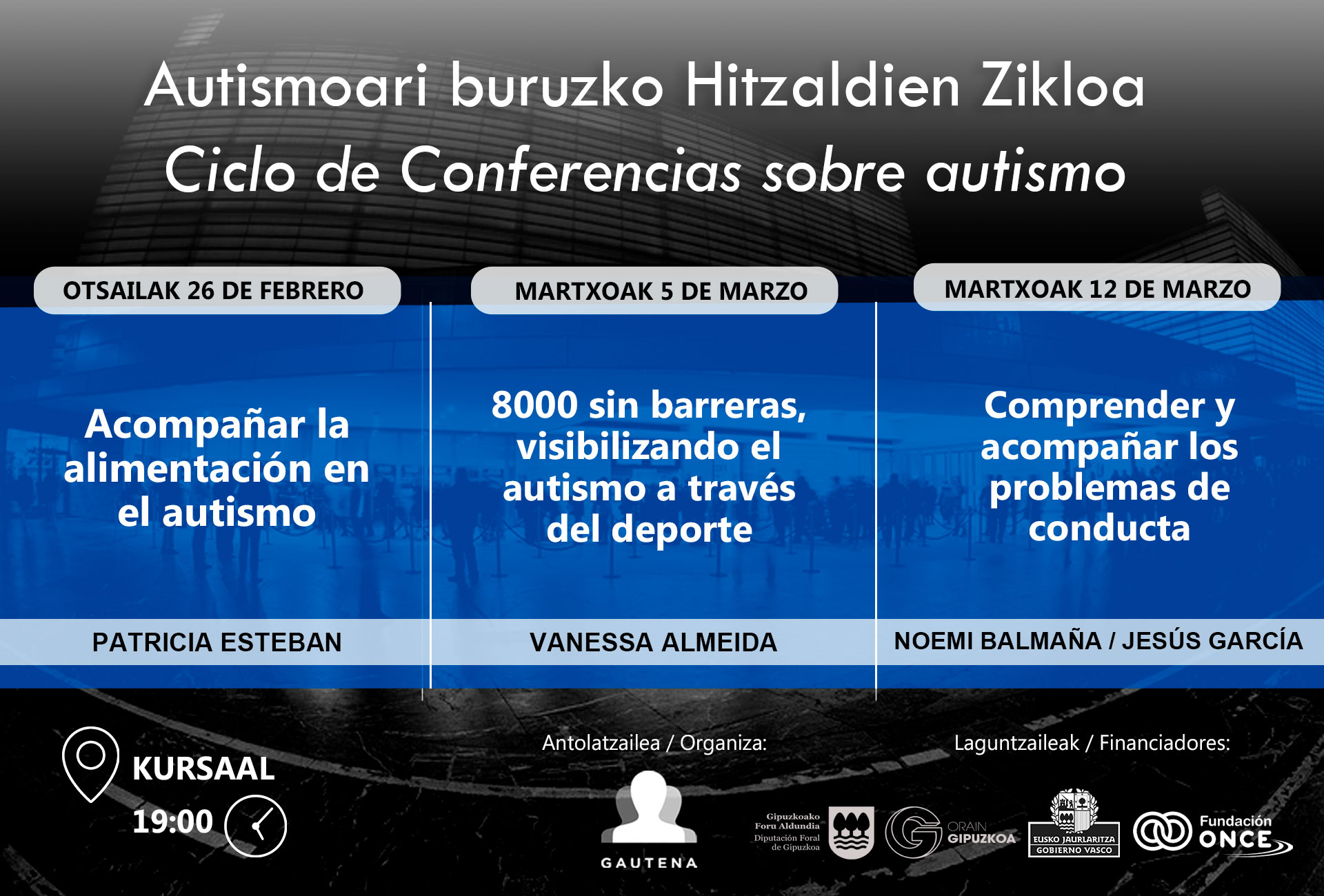 El Kursaal acogerá los días 26 de febrero y 5 y 12 de marzo de 2026, a las 19:00, una nueva edición del Ciclo de Conferencias sobre Autismo organizado por Gautena, centrado este año en la alimentación en el autismo, el deporte como herramienta de inclusión y la comprensión y el acompañamiento de los problemas de conducta.